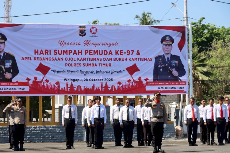 Waingapu_ Dalam semangat memperingati Hari Sumpah Pemuda ke-97, Polres Sumba Timur menggelar Upacara Peringatan Hari Sumpah Pemuda sekaligus Apel Kebangsaan Ojol Kamtibmas dan Buruh Kamtibmas di halaman Mapolres Sumba Timur, Selasa 28/10/2025.